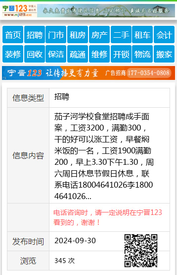 茄子河学校食堂招聘成手面案,工资3200,满勤300,干的好可以涨工资,早餐焖米饭的一名,工资1900满勤200,早上3.30下午1.30,周六周日休息节假日休息,联系电话18004641026李18004641026 【电话咨询时,请一定说明在七台河信息网看到的,谢谢!】 |