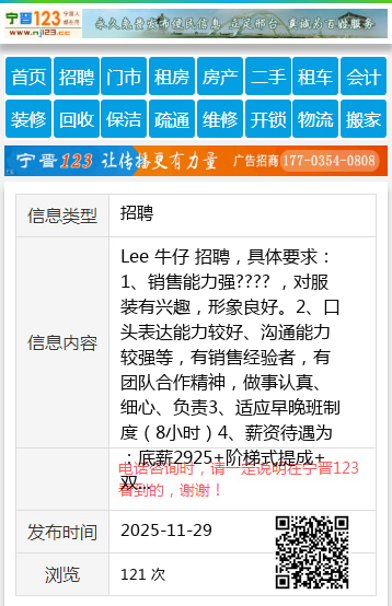 Lee 牛仔 招聘,具体要求:1、销售能力强???? ,对服装有兴趣,形象良好。2、口头表达能力较好、沟通能力较强等,有销售经验者,有团队合作精神,做事认真、细心、负责3、适应早晚班制度(8小时)4、薪资待遇为:底薪2925+阶梯式提成+双薪 上不封顶;周销.月销奖励。实力越强????越多,地址:七台河新玛特6楼Lee 联系人:王女士 电话☎️:15904648498个人15904648498 【电话咨询时,请一定说明在七台河信息网看到的,谢谢!】 |