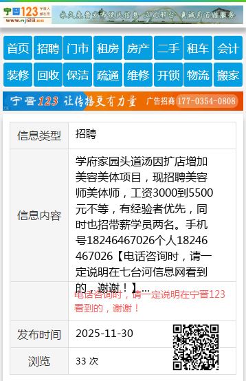 学府家园头道汤因扩店增加美容美体项目,现招聘美容师美体师,工资3000到5500元不等,有经验者优先,同时也招带薪学员两名。手机号18246467026个人18246467026 【电话咨询时,请一定说明在七台河信息网看到的,谢谢!】 |