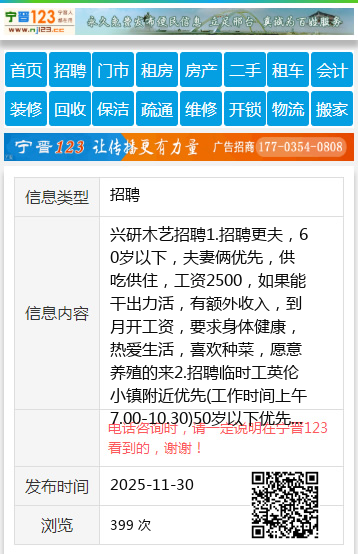 兴研木艺招聘1.招聘更夫,60岁以下,夫妻俩优先,供吃供住,工资2500,如果能干出力活,有额外收入,到月开工资,要求身体健康,热爱生活,喜欢种菜,愿意养殖的来2.招聘临时工英伦小镇附近优先(工作时间上午7.00-10.30)50岁以下优先男女不限10元每小时电话微信19104645511地址英伦小镇14号楼张19104645511 【电话咨询时,请一定说明在七台河信息网看到的,谢谢!】 |