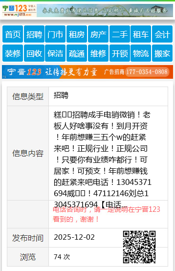 糕❤️招聘成手电销微销!老板人好啥事没有!到月开资!年前想赚三五个w的赶紧来吧!正规行业!正规公司!只要你有业绩咋都行!可居家!可预支!年前想赚钱的赶紧来吧电话!13045371694威❤️!47112146刘总13045371694 【电话咨询时,请一定说明在七台河信息网看到的,谢谢!】 |