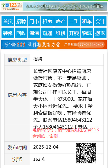 长青社区康养中心招聘厨房做饭师傅,不一定是厨师,家庭妇女做饭好吃就行。正规公司工作可以长干。每周半天休,工资3000。家在海天小区附近优先。 要求干净利索做饭好吃,有经验者优先。联系电话15804643112个人15804643112 【电话咨询时,请一定说明在七台河信息网看到的,谢谢!】 |