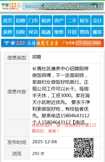 长青社区康养中心招聘厨房做饭师傅,不一定是厨师,家庭妇女做饭好吃就行。正规公司工作可以长干。每周半天休,工资3000。家在海天小区附近优先。 要求干净利索做饭好吃,有经验者优先。联系电话15804643112个人15804643112 【电话咨询时,请一定说明在七台河信息网看到的,谢谢!】 |