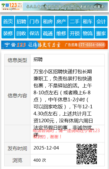 万宝小区招聘快递打包长期兼职工,负责包装打包快递包裹,不是驿站的活。上午8-10点左右(或者晚上6-8点),中午休息1-2小时(可以回家吃饭),下午12-14.30点左右,上述共计月工资1200元,没有休周六周日法定节假日的事,非诚勿扰。详情15645570345个人15645570345 【电话咨询时,请一定说明在七台河信息网看到的,谢谢!】 |