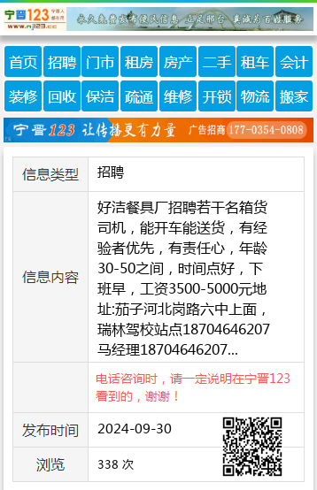 好洁餐具厂招聘若干名箱货司机,能开车能送货,有经验者优先,有责任心,年龄30-50之间,时间点好,下班早,工资3500-5000元地址:茄子河北岗路六中上面,瑞林驾校站点18704646207马经理18704646207 【电话咨询时,请一定说明在七台河信息网看到的,谢谢!】 |