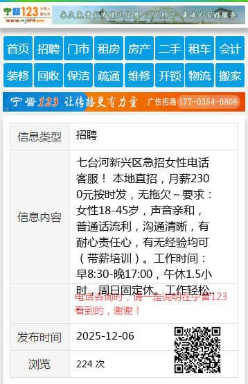 七台河新兴区急招女性电话客服! 本地直招,月薪2300元按时发,无拖欠~要求:女性18-45岁,声音亲和,普通话流利,沟通清晰,有耐心责任心,有无经验均可(带薪培训)。工作时间:早8:30-晚17:00,午休1.5小时,周日固定休。工作轻松无销售压力,办公环境舒适。联系电话13946535559(微信同号),有意速联预约面试!个人13946535559 【电话咨询时,请一定说明在七台河信息网看到的,谢谢!】 |