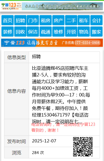 比亚迪腾辉4S店招聘汽车主播2-5人,要求有较好的沟通能力以及学习能力,薪酬每月4000+加绩效工资,工作时间为早9:00—17:00,每月带薪休假2天。中午提供免费午餐,期待你加入!颜经理15304671797 【电话咨询时,请一定说明在七台河信息网看到的,谢谢!】 |