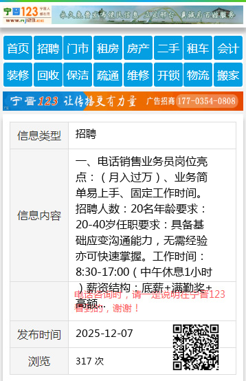 一、电话销售业务员岗位亮点:(月入过万)、业务简单易上手、固定工作时间。招聘人数:20名年龄要求:20-40岁任职要求:具备基础应变沟通能力,无需经验亦可快速掌握。工作时间:8:30-17:00(中午休息1小时)薪资结构:底薪+满勤奖+高额业务提成(多劳多得,收入无上限)二、无人售货柜商品标注员岗位亮点:时间灵活(兼职/全职均可)、日结薪资、低门槛高适配(适合学生/宝妈/副业人群)。招聘人数:不限(男女不限)年龄要求:18-45岁任职要求:无色盲,会基础电脑操作(鼠标、键盘),公司提供免费培训,考核通过即可上岗。工作优势:办公室电脑办公,压力小、难度低,熟练后轻松胜任;多劳多得,月薪2000-5000+,收入上不封顶。工作地点:新兴区商贸博览城E7-124桃山区德政雅居旁边写字楼联系方式:13846422224(可咨询岗位详情或预约面试)李先生13846422224 【电话咨询时,请一定说明在七台河信息网看到的,谢谢!】 |