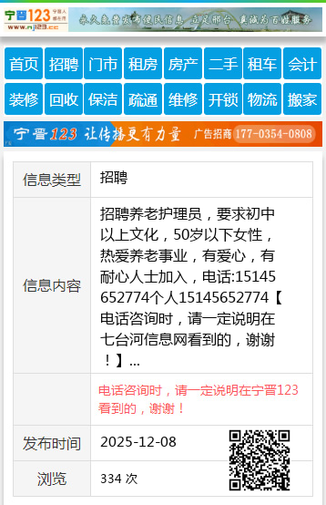 招聘养老护理员,要求初中以上文化,50岁以下女性,热爱养老事业,有爱心,有耐心人士加入,电话:15145652774个人15145652774 【电话咨询时,请一定说明在七台河信息网看到的,谢谢!】 |