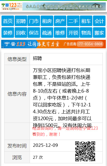 万宝小区招聘快递打包长期兼职工,负责包装打包快递包裹,不是驿站的活。上午8-10点左右(或者晚上6-8点),中午休息1-2小时(可以回家吃饭),下午12-14.30点左右,上述共计月工资1200元,加时间最多可以挣到1500元。没有休周六周日法定节假日的事,非诚勿扰。详情15645570345个人15645570345 【电话咨询时,请一定说明在七台河信息网看到的,谢谢!】 |