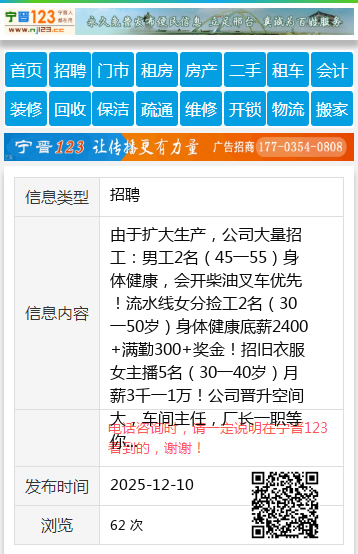 由于扩大生产,公司大量招工:男工2名(45一55)身体健康,会开柴油叉车优先!流水线女分捡工2名(30一50岁)身体健康底薪2400+满勤300+奖金!招旧衣服女主播5名(30一40岁)月薪3千一1万!公司晋升空间大,车间主任,厂长一职等你来,只要你有能力,利丰公司永远给你施展的空间!选择利丰,让你富贵一生!!试用期3天。额满为止!早7:30一16:30中午管饭!厂址:新兴区宝泰隆路26号。公交路线:坐(走葫芦头沟的)1路公交车到(家居广场)站点前走100米恒阳科技公司红大门院内。☎️13946506087个人13946506087 【电话咨询时,请一定说明在七台河信息网看到的,谢谢!】 |