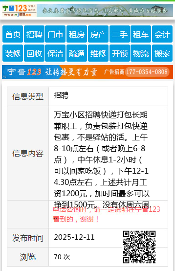 万宝小区招聘快递打包长期兼职工,负责包装打包快递包裹,不是驿站的活。上午8-10点左右(或者晚上6-8点),中午休息1-2小时(可以回家吃饭),下午12-14.30点左右,上述共计月工资1200元,加时间最多可以挣到1500元。没有休周六周日法定节假日的事,非诚勿扰。详情15645570345个人15645570345 【电话咨询时,请一定说明在七台河信息网看到的,谢谢!】 |