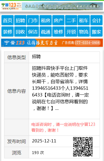 招聘抖音快手平台上门取件快递员,能吃苦耐劳,要求长期干,自带省油车,详情13946516433个人13946516433 【电话咨询时,请一定说明在七台河信息网看到的,谢谢!】 |