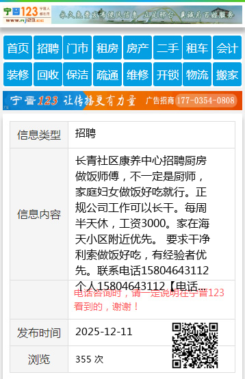 长青社区康养中心招聘厨房做饭师傅,不一定是厨师,家庭妇女做饭好吃就行。正规公司工作可以长干。每周半天休,工资3000。家在海天小区附近优先。 要求干净利索做饭好吃,有经验者优先。联系电话15804643112个人15804643112 【电话咨询时,请一定说明在七台河信息网看到的,谢谢!】 |