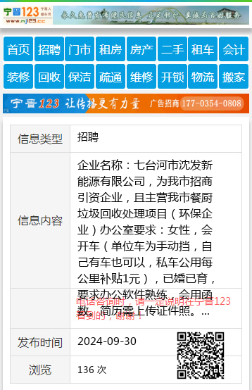 企业名称:七台河市沈发新能源有限公司,为我市招商引资企业,且主营我市餐厨垃圾回收处理项目(环保企业)办公室要求:女性,会开车(单位车为手动挡,自己有车也可以,私车公用每公里补贴1元),已婚已育,要求办公软件熟练,会用函数。简历需上传证件照。干过人事,行政,财务等优先每周单休,车补10元/日。入职次月缴纳社保,每月10日准时发放工资。上班时间早8:00-16:30.法定日休或三倍工资。因我公司业务不多,主要做统计工作,工作内容比较琐碎,所以要求应聘人员心细缜密,有责任心且不娇气,服从分配。可将详细简历发至邮箱444212137@qq.com后,通过后面议。因本人工作忙碌,请不要打电话或加微信。直接将简历发送至邮箱即可。简历可看出人的基本能力。请详细介绍!!!!!简历注明薪资期望,便于反馈。王15804648395 【电话咨询时,请一定说明在七台河信息网看到的,谢谢!】 |