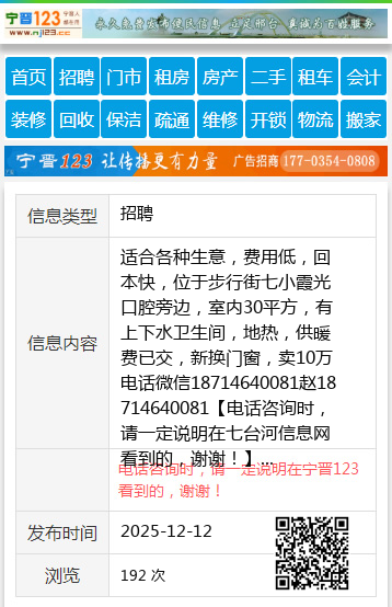 适合各种生意,费用低,回本快,位于步行街七小霞光口腔旁边,室内30平方,有上下水卫生间,地热,供暖费已交,新换门窗,卖10万电话微信18714640081赵18714640081 【电话咨询时,请一定说明在七台河信息网看到的,谢谢!】 |