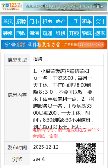 1、小盘菜饭店招聘切菜妇女一名,工资3500,每月一天工休,工作时间早8:00到晚8:30,不会可以教,要求干活手脚麻利一点。2、招聘服务员一名,工资底薪3300满勤200,一天工休,时间早8:30到晚8:30不用值班,到点就可以下班。地址:七号公馆,电话15145698823李15145698823 【电话咨询时,请一定说明在七台河信息网看到的,谢谢!】 |