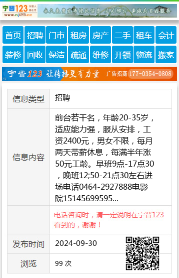 前台若干名,年龄20-35岁,适应能力强,服从安排,工资2400元,男女不限,每月两天带薪休息,每满半年涨50元工龄。早班9点-17点30,晚班12;50-21点30左右进场电话0464-2927888电影院15145699595 【电话咨询时,请一定说明在七台河信息网看到的,谢谢!】 |