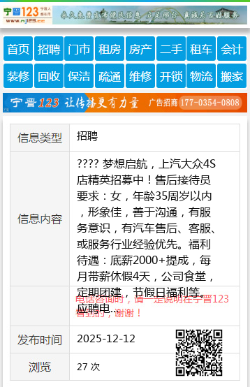 ???? 梦想启航,上汽大众4S店精英招募中!售后接待员要求:女,年龄35周岁以内,形象佳,善于沟通,有服务意识,有汽车售后、客服、或服务行业经验优先。福利待遇:底薪2000+提成,每月带薪休假4天,公司食堂,定期团建,节假日福利等。应聘电话:原经理 18714649878个人18714649878 【电话咨询时,请一定说明在七台河信息网看到的,谢谢!】 |