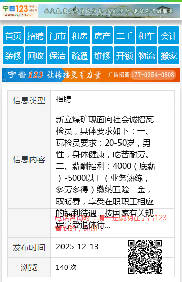 新立煤矿现面向社会诚招瓦检员,具体要求如下:一、瓦检员要求:20-50岁,男性,身体健康,吃苦耐劳。二、薪酬福利:4000(底薪)-5000以上(业务熟练,多劳多得)缴纳五险一金,取暖费,享受在职职工相应的福利待遇,按国家有关规定享受退休待遇。工作制:上一宿歇两天一宿北山,七星花园,北岸,新立煤矿是您很好的选择。私企频繁放假,别在浪费时间了,国企稳定,年纪大了,有个保障。电话(微信同步):许立东13946548503联系时间:早六点~早八点,下午两点~晚八点联系方式区域:新兴区称呼:许立东电话:13946548503微信:13946548503个人1394654850313946548503 【电话咨询时,请一定说明在七台河信息网看到的,谢谢!】 |