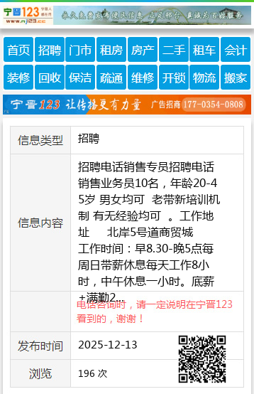 招聘电话销售专员招聘电话销售业务员10名,年龄20-45岁 男女均可 老带新培训机制 有无经验均可 。工作地址 北岸5号道商贸城 工作时间:早8.30-晚5点每周日带薪休息每天工作8小时,中午休息一小时。底薪+满勤2800 普通员工综合工资7000 精英员工8-12000 ,不要想着拿底薪 公司没有拿底薪的员工 公司员工70? 目前精英单王 工资15000 薪资真实无水分 只要你努力,必须有回报。地址:七台河桃山区多伦多联系人:崔先生联系方式:18904645551个人18904645551 【电话咨询时,请一定说明在七台河信息网看到的,谢谢!】 |
