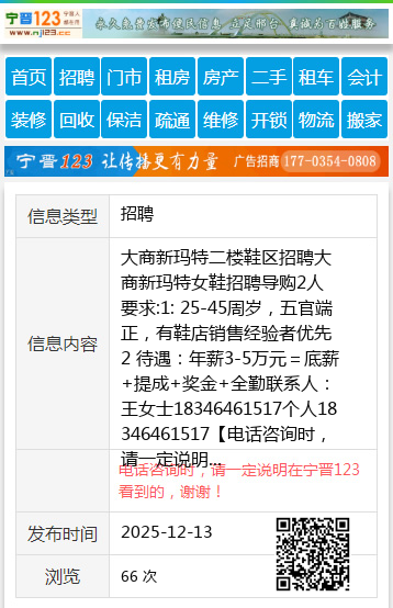大商新玛特二楼鞋区招聘大商新玛特女鞋招聘导购2人要求:1: 25-45周岁,五官端正,有鞋店销售经验者优先2 待遇:年薪3-5万元=底薪+提成+奖金+全勤联系人:王女士18346461517个人18346461517 【电话咨询时,请一定说明在七台河信息网看到的,谢谢!】 |