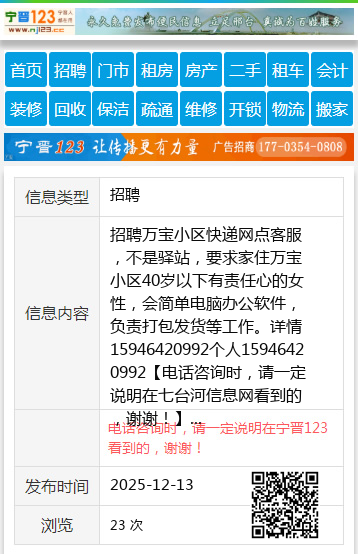 招聘万宝小区快递网点客服,不是驿站,要求家住万宝小区40岁以下有责任心的女性,会简单电脑办公软件,负责打包发货等工作。详情15946420992个人15946420992 【电话咨询时,请一定说明在七台河信息网看到的,谢谢!】 |