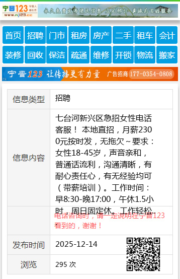 七台河新兴区急招女性电话客服! 本地直招,月薪2300元按时发,无拖欠~要求:女性18-45岁,声音亲和,普通话流利,沟通清晰,有耐心责任心,有无经验均可(带薪培训)。工作时间:早8:30-晚17:00,午休1.5小时,周日固定休。工作轻松无销售压力,办公环境舒适。联系电话13946535559(微信同号),有意速联预约面试!个人13946535559 【电话咨询时,请一定说明在七台河信息网看到的,谢谢!】 |