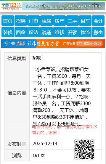 1:小盘菜饭店招聘切菜妇女一名,工资3500,每月一天工休,工作时间早8:00到晚8:30,不会可以教,要求干活手脚麻利一点。2:招聘服务员一名,工资底薪3300满勤200,一天工休,时间早8:30到晚8:30不用值班,到点就可以下班地址七号公馆,电话15145698823个人15145698823 【电话咨询时,请一定说明在七台河信息网看到的,谢谢!】 |