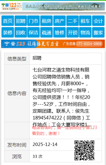七台河君之道生物科技有限公司招聘微信销售人员,销售经验优先,月薪8000+,有无经验均可!一对一指导,公司提供资源!!!年纪20岁---52岁,工作时间自由,定期团建。联系人:侯先生18945474222(同微信)工作地点:工会大厦写字楼1907室个人18945474222 【电话咨询时,请一定说明在七台河信息网看到的,谢谢!】 |