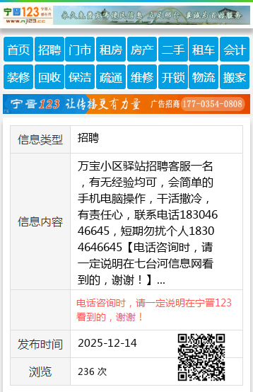 万宝小区驿站招聘客服一名,有无经验均可,会简单的手机电脑操作,干活撒冷,有责任心,联系电话18304646645,短期勿扰个人18304646645 【电话咨询时,请一定说明在七台河信息网看到的,谢谢!】 |