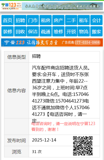 汽车配件商店招聘送货人员。要求:会开车,送货时不东张西望注意力集中,年龄22--36岁之间,上班时间:早7点半到晚上6点。电话:15704641273微信:15704641273电话不通就加微信个人15704641273 【电话咨询时,请一定说明在七台河信息网看到的,谢谢!】 |