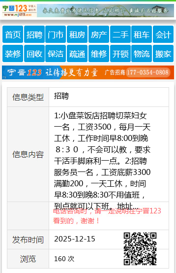 1:小盘菜饭店招聘切菜妇女一名,工资3500,每月一天工休,工作时间早8:00到晚8:30,不会可以教,要求干活手脚麻利一点。2:招聘服务员一名,工资底薪3300满勤200,一天工休,时间早8:30到晚8:30不用值班,到点就可以下班。地址:七号公馆,电话15145698823个人15145698823 【电话咨询时,请一定说明在七台河信息网看到的,谢谢!】 |