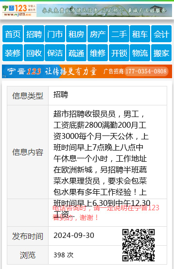 超市招聘收银员员,男工,工资底薪2800满勤200月工资3000每个月一天公休,上班时间早上7点晚上八点中午休息一个小时,工作地址在欧洲新城,另招聘半班蔬菜水果理货员,要求会包菜包水果有多年工作经验!上班时间早上6.30到中午12.30工资1800工作地点在银泉小区王18504645127 【电话咨询时,请一定说明在七台河信息网看到的,谢谢!】 |
