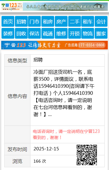 冷面厂招送货司机一名,底薪3500,详情面议,联系电话15946410390(咨询请下午打电话)个人15946410390 【电话咨询时,请一定说明在七台河信息网看到的,谢谢!】 |