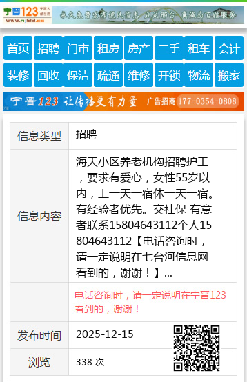 海天小区养老机构招聘护工,要求有爱心,女性55岁以内,上一天一宿休一天一宿。有经验者优先。交社保 有意者联系15804643112个人15804643112 【电话咨询时,请一定说明在七台河信息网看到的,谢谢!】 |