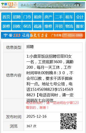 1:小盘菜饭店招聘切菜妇女一名,工资底薪3600,满勤200,每月一天工休,工作时间早8:00到晚8:30,不会可以教,要求干活手脚麻利一点。地址七号公馆,电话15145698823李15145698823 【电话咨询时,请一定说明在七台河信息网看到的,谢谢!】 |
