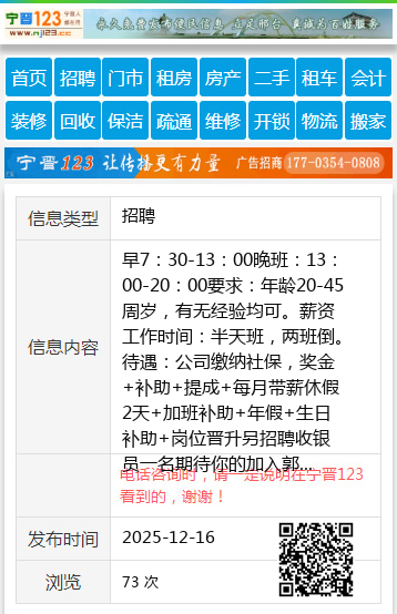 早7:30-13:00晚班:13:00-20:00要求:年龄20-45周岁,有无经验均可。薪资工作时间:半天班,两班倒。待遇:公司缴纳社保,奖金+补助+提成+每月带薪休假2天+加班补助+年假+生日补助+岗位晋升另招聘收银员一名期待你的加入郭女士13846427598 【电话咨询时,请一定说明在七台河信息网看到的,谢谢!】 |
