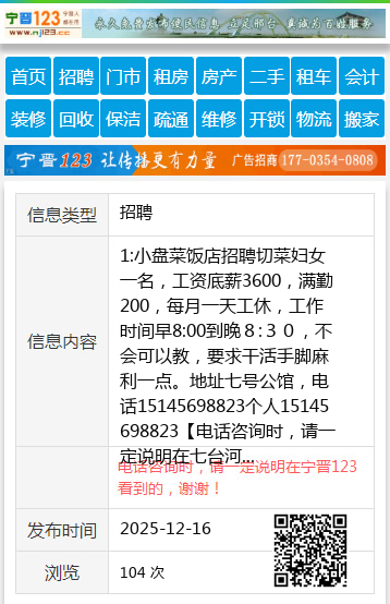 1:小盘菜饭店招聘切菜妇女一名,工资底薪3600,满勤200,每月一天工休,工作时间早8:00到晚8:30,不会可以教,要求干活手脚麻利一点。地址七号公馆,电话15145698823个人15145698823 【电话咨询时,请一定说明在七台河信息网看到的,谢谢!】 |