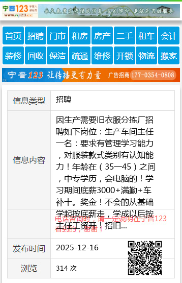 因生产需要旧衣服分拣厂招聘如下岗位:生产车间主任一名:要求有管理学习能力,对服装款式类别有认知能力!年龄在(35一45)之间,中专学历,会电脑的!学习期间底薪3000+满勤+车补十。奖金!不会的从基础学起按底薪走,学成以后按主任工资开!招旧衣服分拣女工若干名,(30一50岁)身体健康底薪2400+满勤300+奖金!以上工种只招长期工!短工勿扰!招旧衣服女主播5名(30一40岁)月薪3千一1万!公司晋升空间大,车间主任,厂长一职等你来,只要你有能力,利丰公司永远给你施展的空间!选择利丰,让你富贵一生!!试用期3天。额满为止!早7:30一16:30中午管饭!厂址:新兴区宝泰隆路26号。公交路线:坐(走葫芦头沟的)1路公交车到(家居广场)站点前走100米恒阳科技公司红大门院内。☎️13946506087个人13946506087 【电话咨询时,请一定说明在七台河信息网看到的,谢谢!】 |