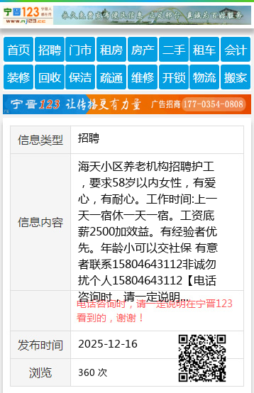 海天小区养老机构招聘护工,要求58岁以内女性,有爱心,有耐心。工作时间:上一天一宿休一天一宿。工资底薪2500加效益。有经验者优先。年龄小可以交社保 有意者联系15804643112非诚勿扰个人15804643112 【电话咨询时,请一定说明在七台河信息网看到的,谢谢!】 |