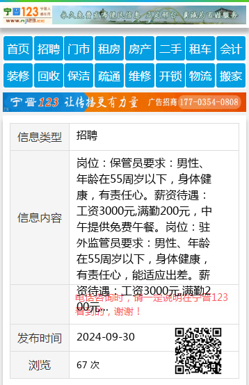 岗位:保管员要求:男性、年龄在55周岁以下,身体健康,有责任心。薪资待遇:工资3000元,满勤200元,中午提供免费午餐。岗位:驻外监管员要求:男性、年龄在55周岁以下,身体健康,有责任心,能适应出差。薪资待遇:工资3000元,满勤200元,出差有补助,报销路费。岗位:安全员要求:男性、年龄在55周岁以下,有安全证,负责现场管理及内业。薪资待遇:工资3500元,试用期3个月,试用期内工资3200元,中午提供免费午餐。联系电话:15204641004赵女士15204641004 【电话咨询时,请一定说明在七台河信息网看到的,谢谢!】 |