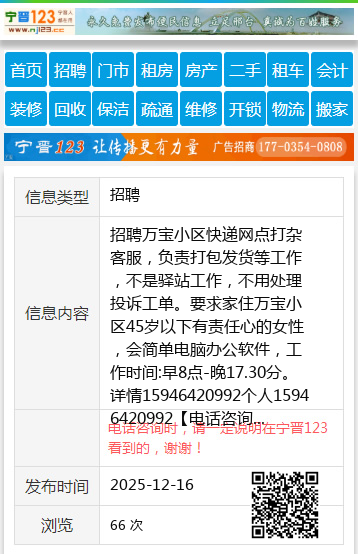 招聘万宝小区快递网点打杂客服,负责打包发货等工作,不是驿站工作,不用处理投诉工单。要求家住万宝小区45岁以下有责任心的女性,会简单电脑办公软件,工作时间:早8点-晚17.30分。详情15946420992个人15946420992 【电话咨询时,请一定说明在七台河信息网看到的,谢谢!】 |