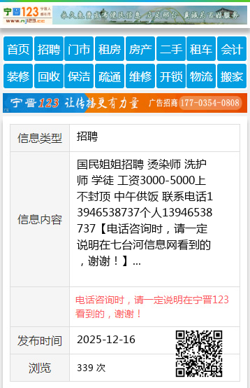 国民姐姐招聘 烫染师 洗护师 学徒 工资3000-5000上不封顶 中午供饭 联系电话13946538737个人13946538737 【电话咨询时,请一定说明在七台河信息网看到的,谢谢!】 |
