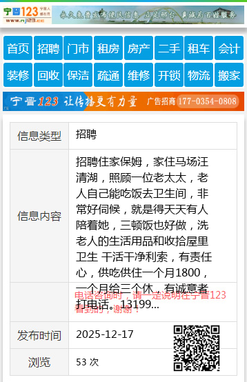 招聘住家保姆,家住马场汪清湖,照顾一位老太太,老人自己能吃饭去卫生间,非常好伺候,就是得天天有人陪着她,三顿饭也好做,洗老人的生活用品和收拾屋里卫生 干活干净利索,有责任心,供吃供住一个月1800,一个月给三个休,有诚意者打电话。13199235929赵女士个人13199235929 【电话咨询时,请一定说明在七台河信息网看到的,谢谢!】 |