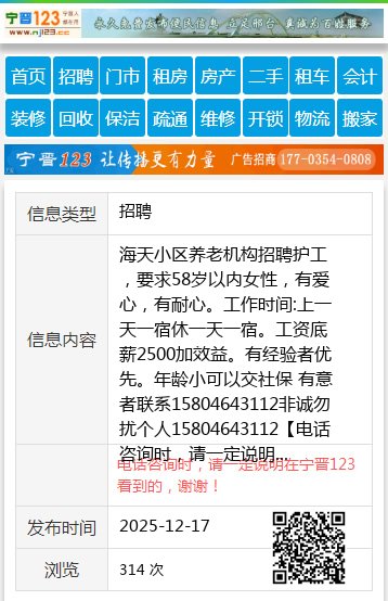 海天小区养老机构招聘护工,要求58岁以内女性,有爱心,有耐心。工作时间:上一天一宿休一天一宿。工资底薪2500加效益。有经验者优先。年龄小可以交社保 有意者联系15804643112非诚勿扰个人15804643112 【电话咨询时,请一定说明在七台河信息网看到的,谢谢!】 |