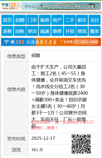 由于扩大生产,公司大量招工:男工2名(45一55)身体健康,会开柴油叉车优先!流水线女分捡工2名(30一50岁)身体健康底薪2400+满勤300+奖金!招旧衣服女主播5名(30一40岁)月薪3千一1万!公司晋升空间大,车间主任,厂长一职等你来,只要你有能力,利丰公司永远给你施展的空间!选择利丰,让你富贵一生!!试用期3天。额满为止!早7:30一16:30中午管饭!厂址:新兴区宝泰隆路26号。公交路线:坐(走葫芦头沟的)1路公交车到(家居广场)站点前走100米恒阳科技公司红大门院内。☎️13946506087个人13946506087 【电话咨询时,请一定说明在七台河信息网看到的,谢谢!】 |