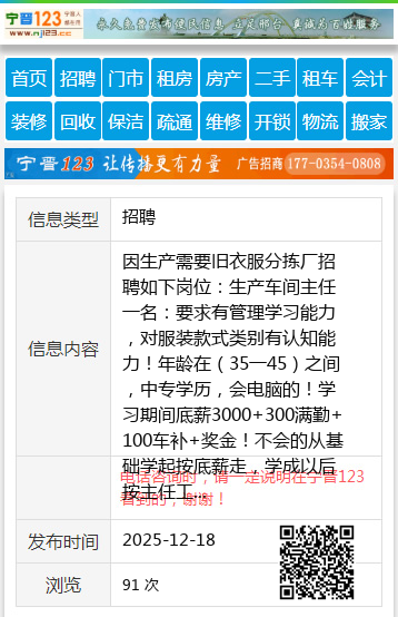 因生产需要旧衣服分拣厂招聘如下岗位:生产车间主任一名:要求有管理学习能力,对服装款式类别有认知能力!年龄在(35一45)之间,中专学历,会电脑的!学习期间底薪3000+300满勤+100车补+奖金!不会的从基础学起按底薪走,学成以后按主任工资开!短期没能力不能吃苦的勿扰!招旧衣服分拣女工若干名,(30一50岁)身体健康底薪2400+满勤300+奖金!以上工种只招长期工!短工勿扰!招旧衣服女主播5名(30一40岁)月薪3千一1万!公司晋升空间大,车间主任,厂长一职等你来,只要你有能力,利丰公司永远给你施展的空间!选择利丰,让你富贵一生!!试用期3天。额满为止!早7:30一16:30中午管饭!厂址:新兴区宝泰隆路26号。公交路线:坐(走葫芦头沟的)1路公交车到(家居广场)站点前走100米恒阳科技公司红大门院内。☎️13946506087个人13946506087 【电话咨询时,请一定说明在七台河信息网看到的,谢谢!】 |