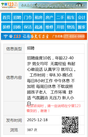 招聘座席10名,年龄22-40岁 男女均可 无需经验 有耐心敢说话 认真学习 就可以 。 工作时间:早8.30-晚5点 每日8小时工作 中午休息 不加班 每周日休息 不耽误照顾孩子老人 工作环境 舒适 气氛融洽 无压力 新人小白 头一个月3-4千 二个月 5-7千 3个月后7-1万 每月15日准时发工资 不拖不压 来吧 努力就有回报 给彼此一个相识的机会 。地址:七台河 桃山区 新兴区 勃利县 均可 就近上半电话微信:18904645551个人18904645551 【电话咨询时,请一定说明在七台河信息网看到的,谢谢!】 |