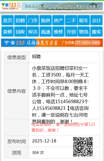 小盘菜饭店招聘切菜妇女一名,工资3500,每月一天工休,工作时间早8:00到晚8:30,不会可以教,要求干活手脚麻利一点,地址七号公馆,电话15145698823个人15145698823 【电话咨询时,请一定说明在七台河信息网看到的,谢谢!】 |